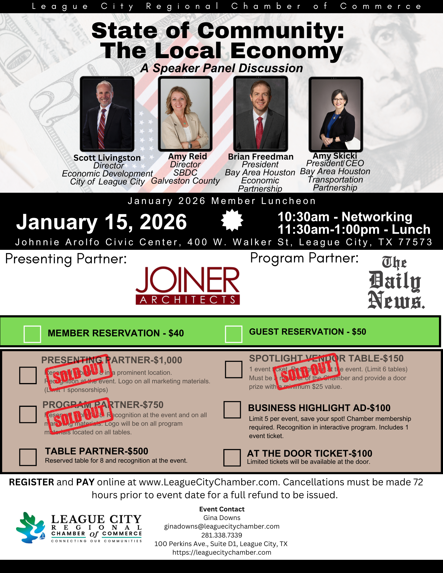 Join us for a powerful morning of insight, connection, and celebration at the State of the Community: The Local Economy event, where we’ll take a closer look at the forces shaping League City’s economic landscape and what’s ahead for our region.