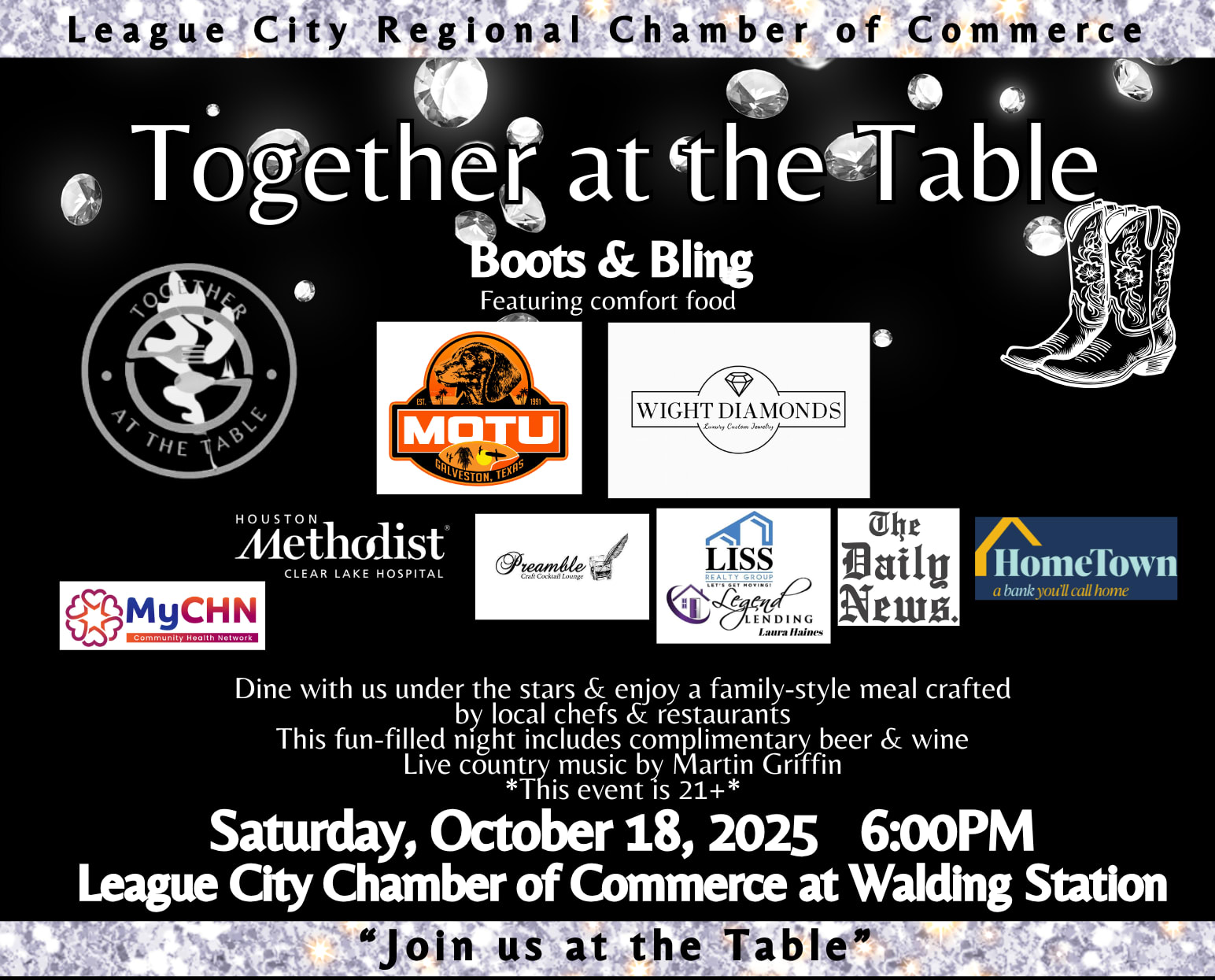 Boots & Bling isn’t just a theme—it’s a reason to dress up, break bread, and belong. Seats are limited for this one-table experience under the stars. Purchase your seat and join us—