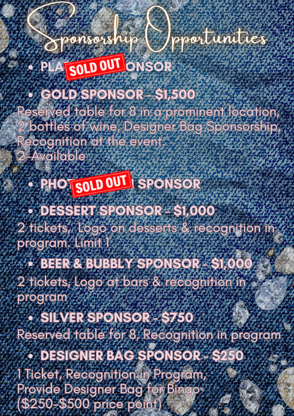 Get ready for a night where casual meets classy at Denim, Diamonds, Designer Bags & Bingo! Slip on your favorite jeans, add a little sparkle, and join us for an evening filled with laughter, friendly competition, and fabulous prizes.