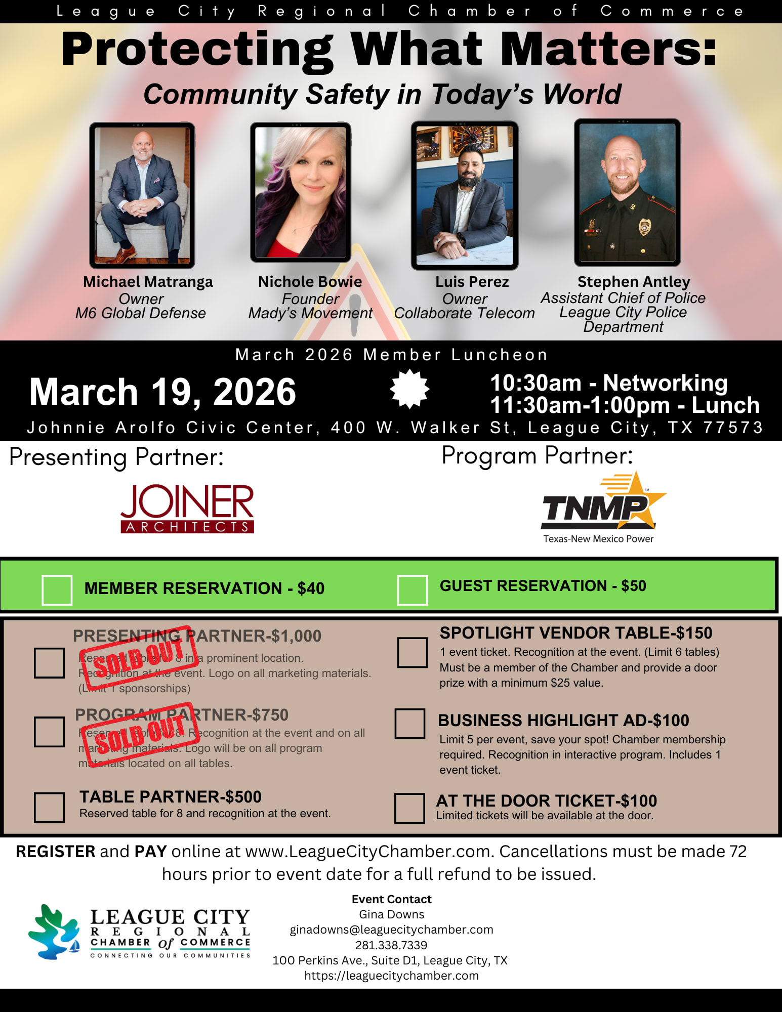 - Assistant Police Chief Stephen Antley, League City Police Department, providing perspective on community safety and law enforcement partnerships