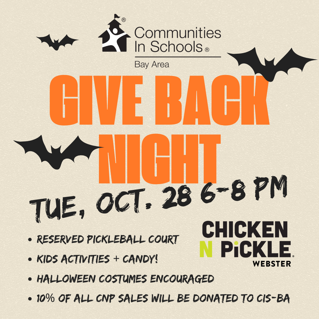 Join Communities In Schools - Bay Area for a Spooktacular Give Back Night at Chicken N Pickle on Tuesday, October 28th from 6-8 PM!