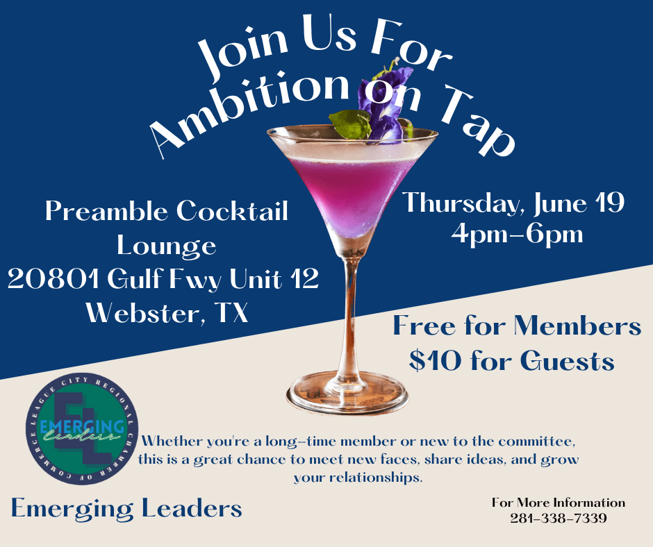 Join us for Emerging Leaders Ambition on Tap and support a local, Chamber business!! This is a great time for networking and building connections.