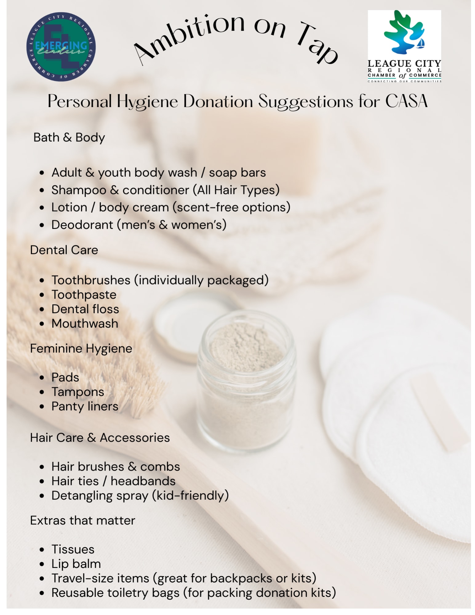 Bring in 5 Personal Hygiene items for CASA Galveston County and receive a FREE dessert!