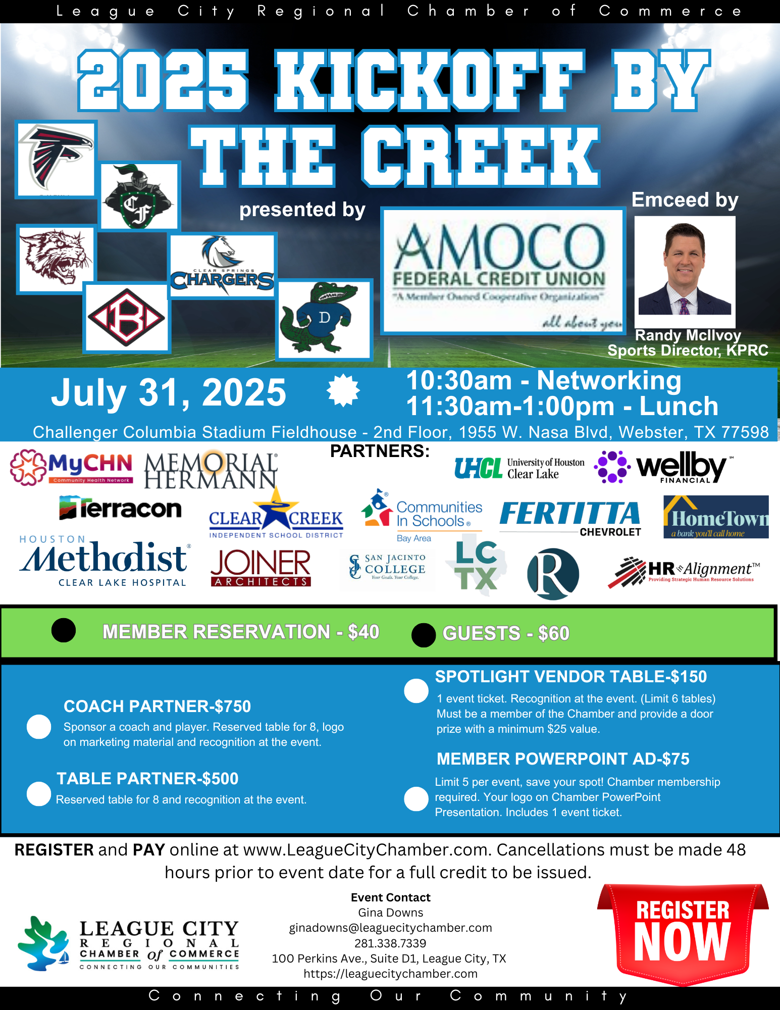We will be recognizing all CCISD and DISD football programs. Coaches will be discussing the upcoming season. Event will take place at the Challenger Columbia Stadium Field House 2nd Floor 1955 W. Nasa Blvd Webster, TX 77598
