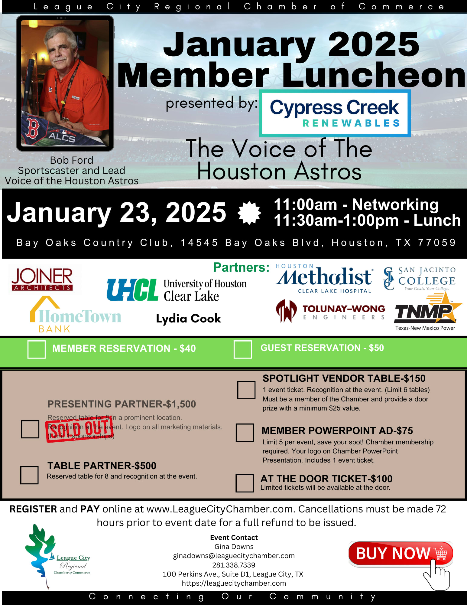 Membership Luncheon featuring Bob Ford - Public Address Announcer for the Houston Astros presented by Cypress Creek Renewables