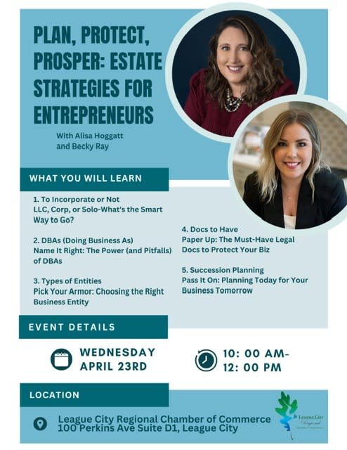 Join estate planning attorney, Alisa Hoggett, as she goes into what an estate attorney can do for you, documents you should have, and more. We will finish with a Q&A.
